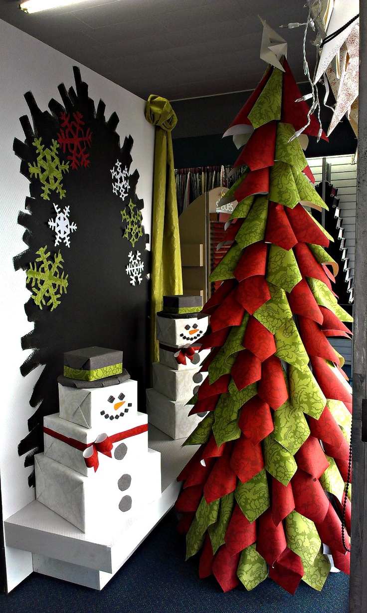 Altra idea. Se vuoi inserire dei pupazzi di neve puoi prendere spunto da questa vetrina natalizia. Dove il pupazzo di neve è stato realizzato semplicemente con delle scatole di cartone ricoperte con della carta decorata. Trovo sia molto originale come idea e anche poco dispendiosa.